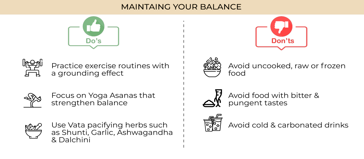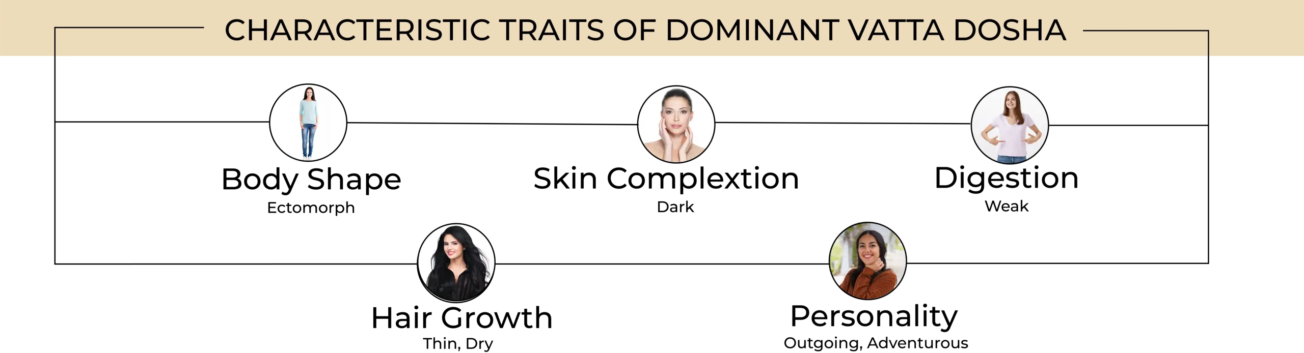 With Vata as your dominant Dosha, you have a Vata Dosha prominent type or Prakriti. Since Vata comprises of ether & air, its main qualities are lightness, dryness & mobility. These qualities define your physical, mental & emotional traits.